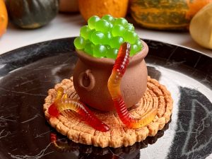 Котел - сливочный мусс с молочным шоколадом и начинкой «Малиновое конфи», зелье - яблочные джус боллы, спил дерева - карамельная Панакота