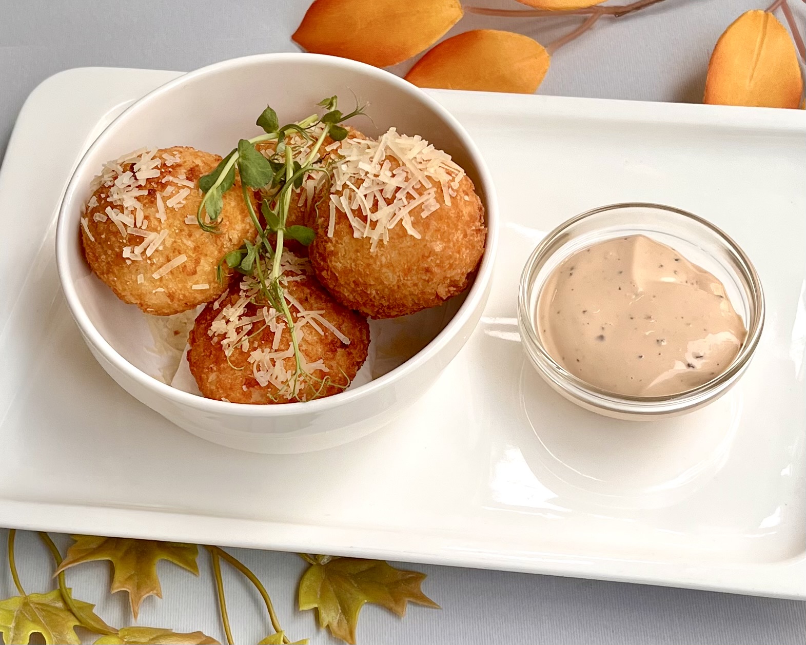 Хрустящие шарики из итальянского риса Арборио с начинкой из мясного рагу и сыра Чеддер, подаются под сыром Пармезан с грибным соусом