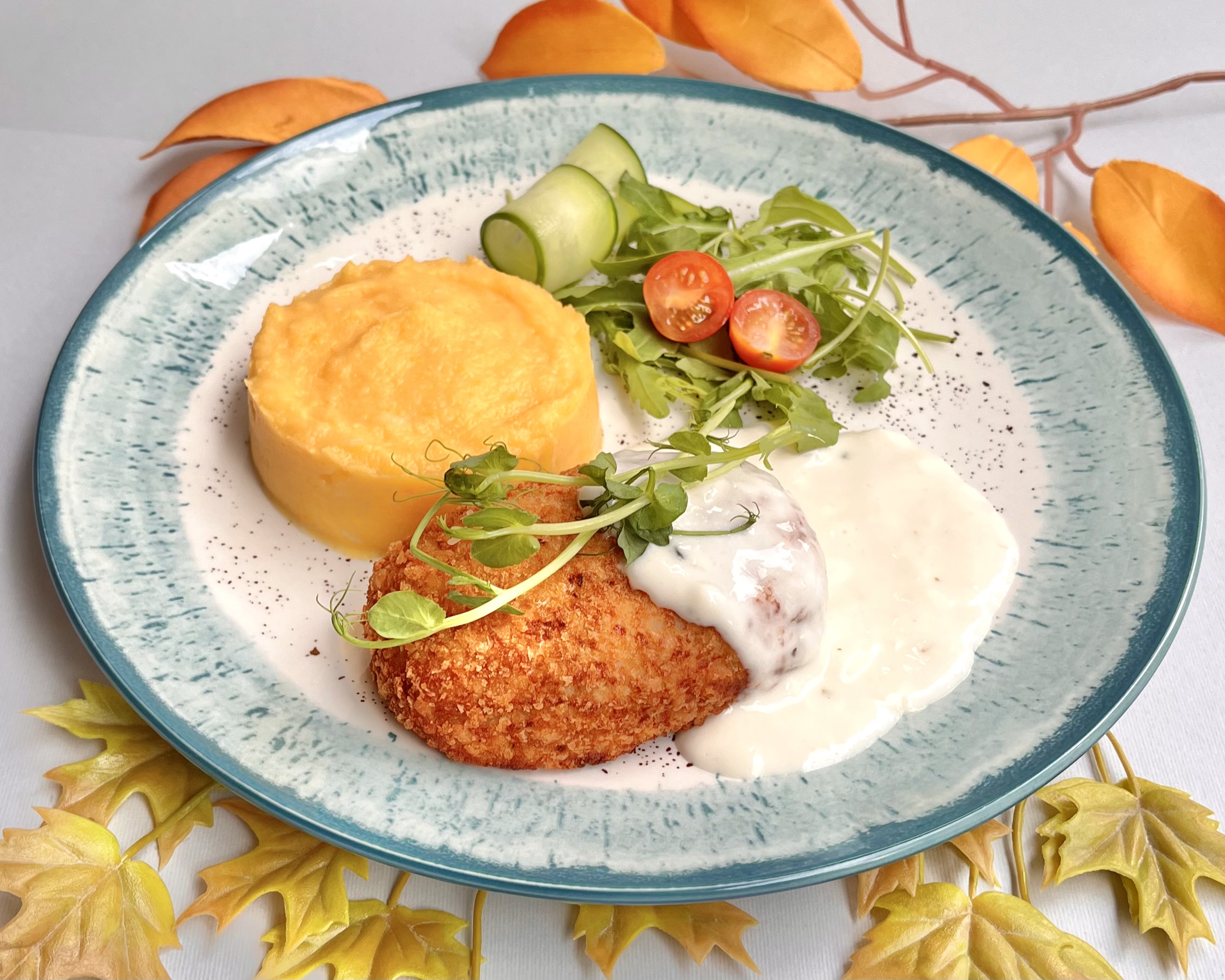 Котлета из грудки индейки в панировке с сырной начинкой «Чеддер», подается с тыквенно-картофельным пюре и сливочным соусом